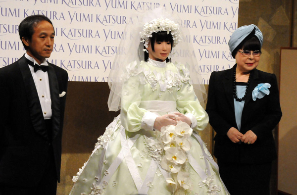 El robot humanoide HRP-4C ha desfilado vestido de novia en la presentación de la colección de la diseñadora coreana Yumi Katsura París 2009, que ha tenido lugar hoy en Osaka, Japón. Según los organizadores, se trata de la primera vez que un robot hace el papel de una novia modelo.